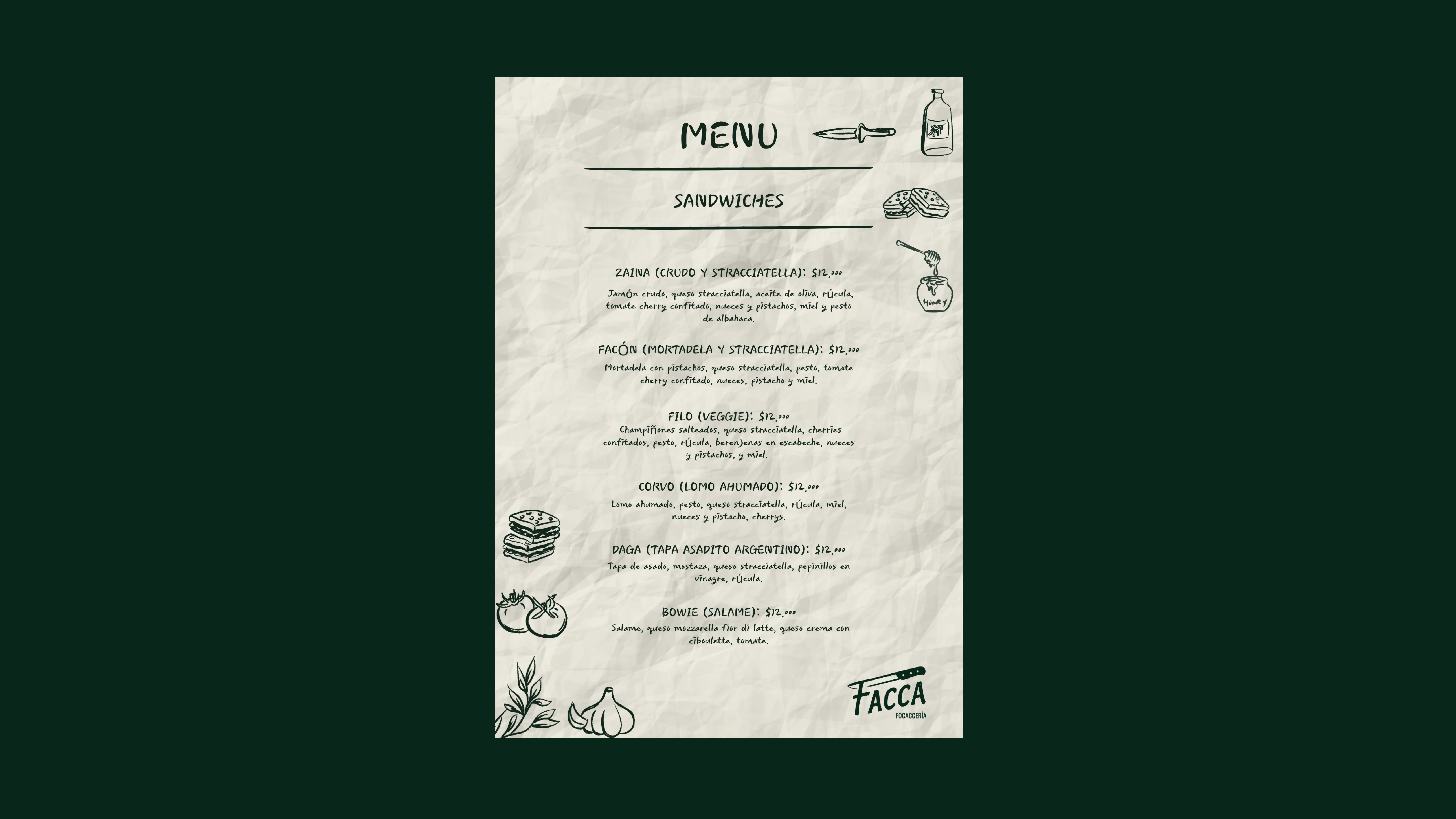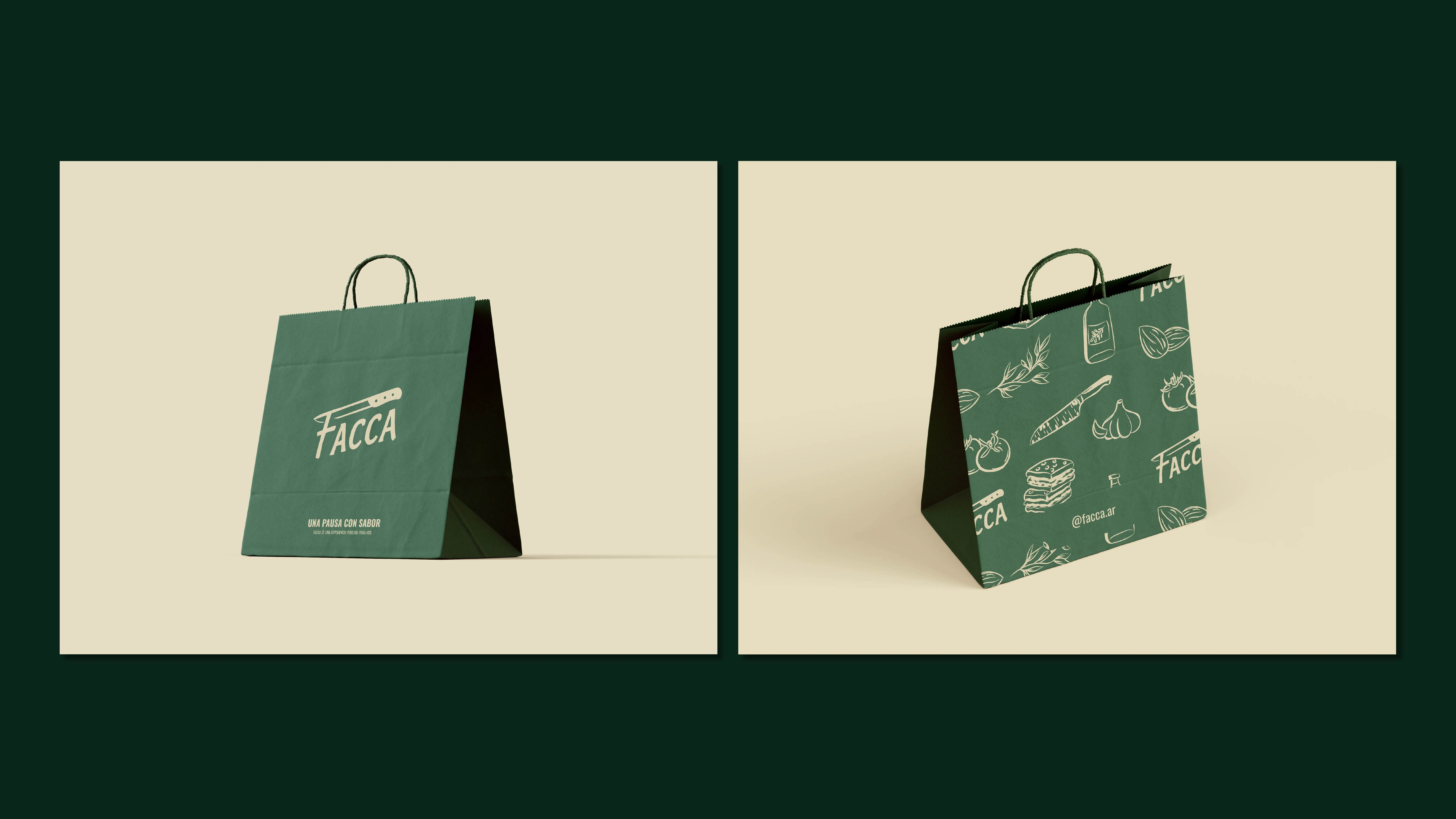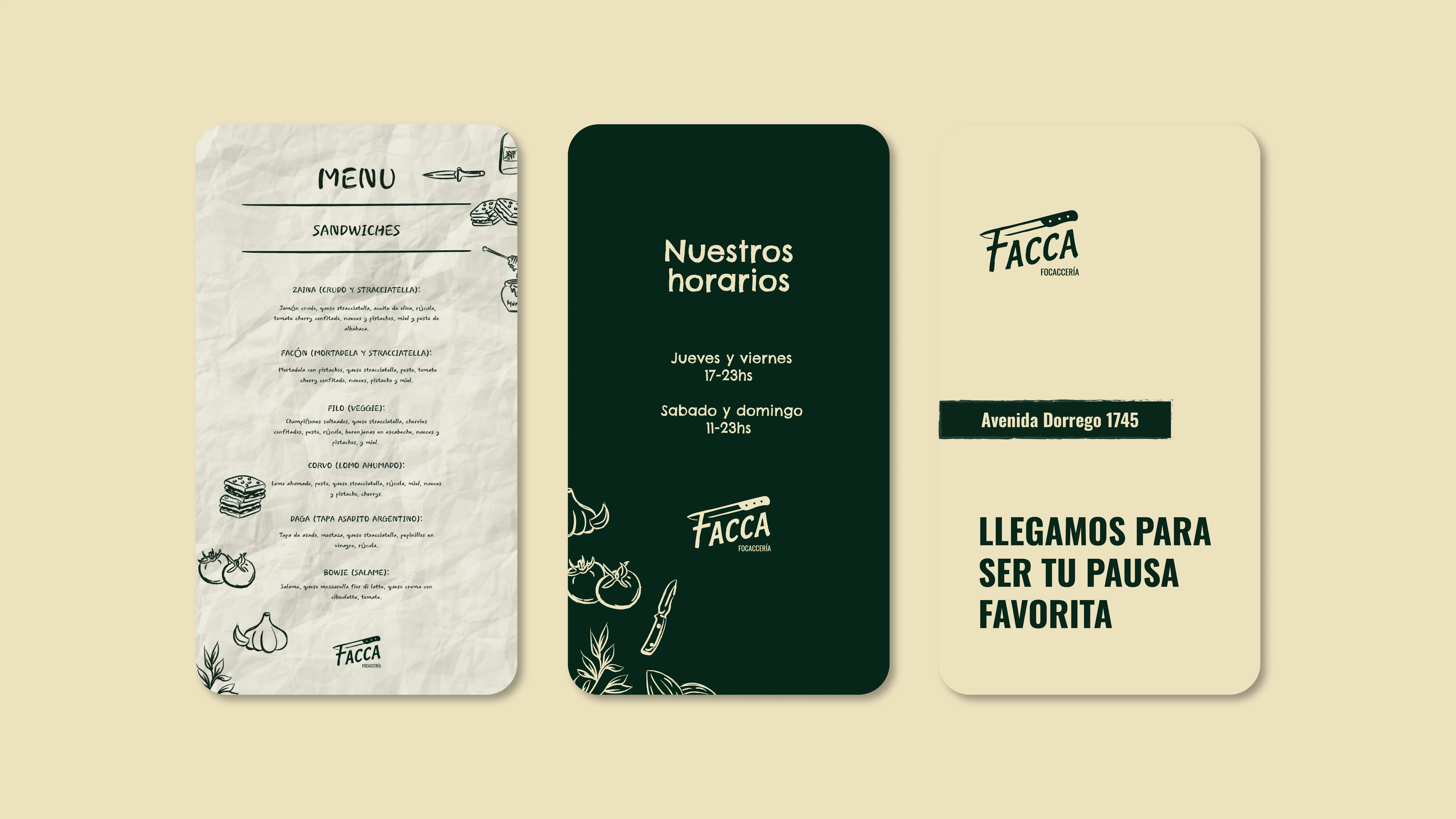 Facca nació como un lugar para juntarse. Un garage, amigos, charlas largas y ganas de compartir algo simple. El diseño acompaña ese espíritu: colores cálidos, tipografías con carácter y una estética rústica y minimalista que se siente honesta y real. Una marca pensada para invitar a quedarse, a compartir una focaccia, una cerveza y un buen momento.